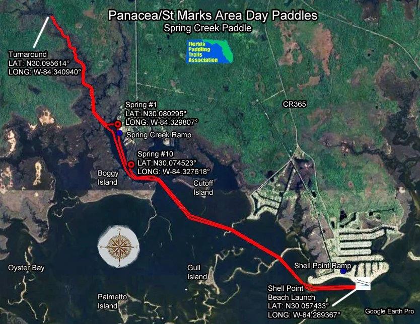 Description: This paddle offers some variety, open water paddling, navigation around oyster bars, visiting springs and a great tannic creek paddle. Spring Creek is aptly named for it’s 13 springs located near the creek’s mouth. Unfortunately, the tannic creek does not allow for the usual clear Florida springs vistas. However you can see a few of the boils as they reach the surface, especially Spring #1 with an extremely high outflow, and the smaller Spring #2 (See Map). The creek itself goes almost all the way to the Florida Hiking Trail.