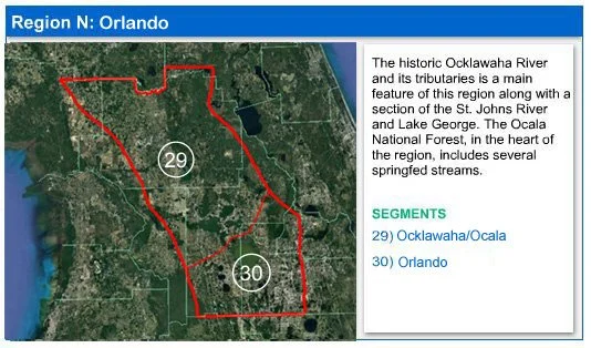 The historic Ocklawaha River and its tributaries is a main feature of this region along with a section of the St. Johns River and Lake George. The Ocala National Forest, in the heart of the region, includes several spring fed streams such as Juniper Springs Run, Alexander Springs Run and Salt Springs Run.