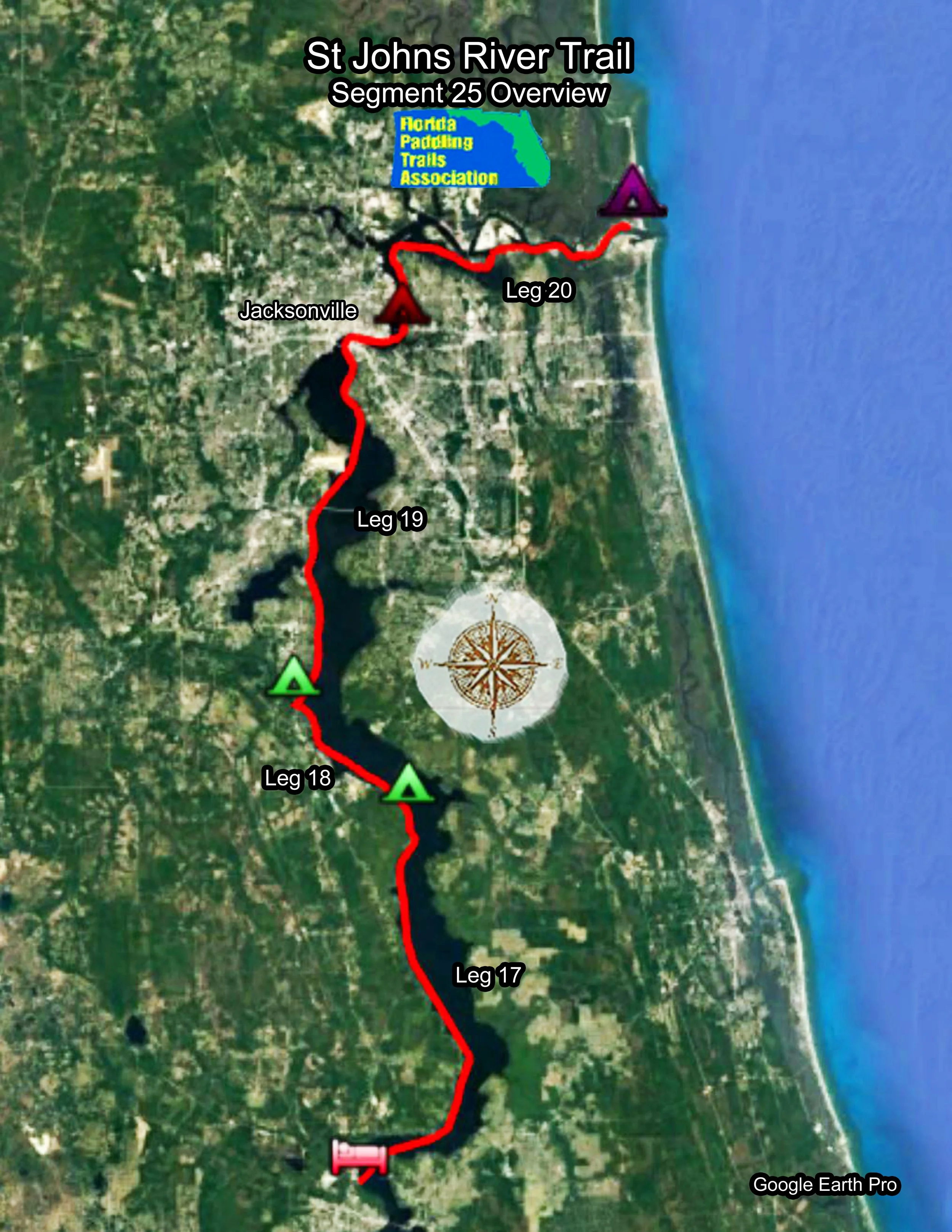 This last Segment consists of legs 17 through 21 of the Lower Basin of the 310 mile long north flowing river. It is the longest flowing river in Florida. The campsites at Exchange Island Park are now officially opened. The last phase of Park development included adding two primitive campsites with fire rings and picnic tables, and is now complete and available. Access to the small basin near the campsites has signage inside the basin, however the basin is only accessible at medium to high tide, so plan your entry accordingly. Exchange Island Reservations are required and can be made through the City of Jacksonville Parks and Recreation, which also handles the reservations for the Huguenot Memorial Park campsites at the rivers end. Please practice “Leave No Trace” principles when using all campsites. Water levels on the river vary considerably with rainfall amounts and tidal action. Some of these final legs are 20+ miles long and stronger tidal currents become an increasingly important consideration the closer you get to the mouth of the river. So, plan to use them to your advantage by riding the outgoing tide. It can be almost impossible to paddle against the tidal surge. Stay out of the channel and along the shoreline where possible. Remember to stay at least 100 yards away from military vessels. Wind can be an important factor on some of the wider parts of the St Johns. Always make sure to carry plenty of water and food. Make sure you leave a good float plan. Carry good maps, a compass and GPS. This Segment is recommended for advanced paddlers only due to strong tidal currents, heavy powerboat traffic and exposure due to the width of the river. Make sure you make reservations ahead of time at all State, City, and private campgrounds to make sure you have a campsite upon arrival. For the remainder of the St Johns River Trail, see Segments 22, 23, and 24.